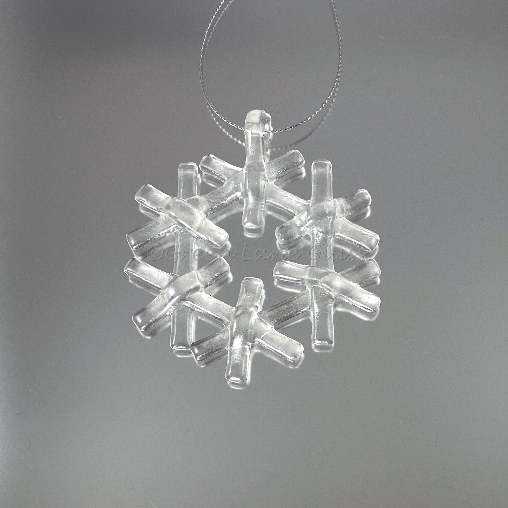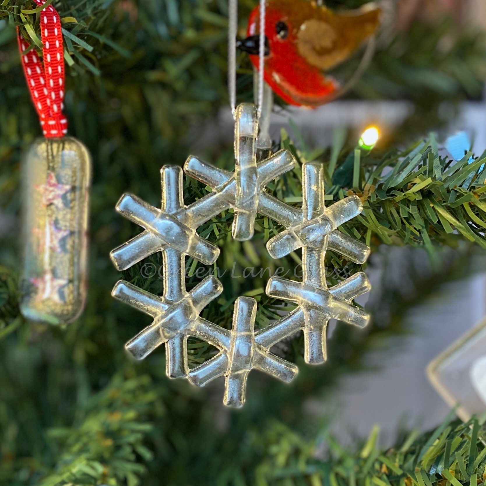 A handmade snowflake in beautiful iridescent clear glass, which shines with a myriad of different colours when it catches the light.  (It’s really difficult to capture the gorgeous colours in a photograph!)